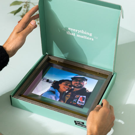 Simply choose your frame color and upload a photo. We’ll print, frame, and deliver it in a green-blue gift box.
